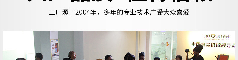 廣州旭眾食品機(jī)械有限公司是一家集科研開(kāi)發(fā),生產(chǎn)設(shè)計(jì),營(yíng)銷(xiāo)服務(wù)為一體的現(xiàn)代化生產(chǎn)企業(yè)?,F(xiàn)代化生產(chǎn)車(chē)間,精湛制造技術(shù),所產(chǎn)機(jī)械歷經(jīng)市場(chǎng)重重考驗(yàn),不斷贏得海內(nèi)外客戶的贊譽(yù)。