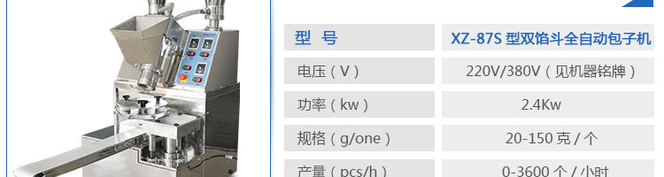 XZ-87S型雙餡斗全自動包子機,可生產各種肉包、肉菜包、菜包、小籠包、湯包、水晶包、圓饅頭、奶黃包、豆沙包、叉燒包、南瓜餅等幾十種包餡制品。適用于賓館、飯店、學校、機關企業(yè)食堂、饅頭或包子加工廠、早餐工程店及速凍食品廠等單位??蓾M足不同客戶群體。免費提供工藝技術。免費上門培訓指導安裝。