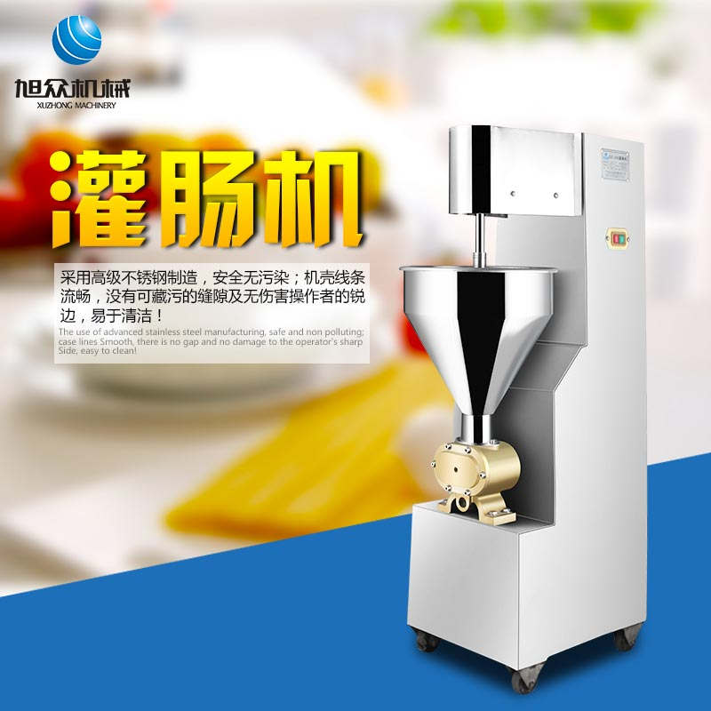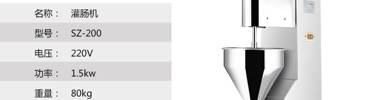 SZ-200灌腸機(jī),適合灌制各種香腸、紅腸、臘腸及糊狀制品。本機(jī)使用敞開式不銹鋼料斗,適用于連續(xù)添加物料;與灌裝手接觸部件全部采用優(yōu)質(zhì)不銹鋼制作以防生銹;該機(jī)自動貨程度高,技術(shù)先進(jìn)、性能穩(wěn)定、操作簡便、工作效率高,具有不破壞物料成份,保質(zhì)、保鮮等特點(diǎn)。