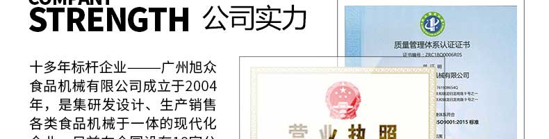 廣州旭眾食品機械有限公司是一家集科研開發(fā),生產(chǎn)設(shè)計,營銷服務(wù)為一體的現(xiàn)代化生產(chǎn)企業(yè)。現(xiàn)代化生產(chǎn)車間,精湛制造技術(shù),所產(chǎn)機械歷經(jīng)市場重重考驗,不斷贏得海內(nèi)外客戶的贊譽。