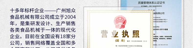 廣州旭眾食品機械有限公司是一家集科研開發(fā),生產(chǎn)設計,營銷服務為一體的現(xiàn)代化生產(chǎn)企業(yè)?,F(xiàn)代化生產(chǎn)車間,精湛制造技術,所產(chǎn)機械歷經(jīng)市場重重考驗,不斷贏得海內外客戶的贊譽。