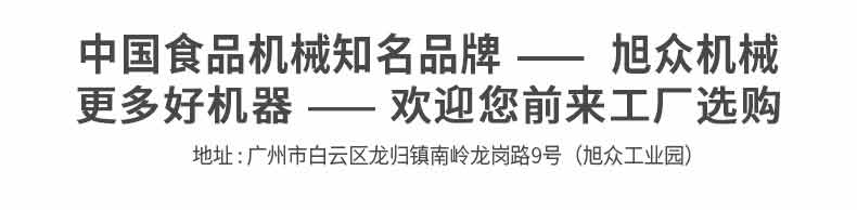 廣州旭眾食品機(jī)械有限公司是一家集科研開發(fā),生產(chǎn)設(shè)計,營銷服務(wù)為一體的現(xiàn)代化生產(chǎn)企業(yè)?,F(xiàn)代化生產(chǎn)車間,精湛制造技術(shù),所產(chǎn)機(jī)械歷經(jīng)市場重重考驗,不斷贏得海內(nèi)外客戶的贊譽。